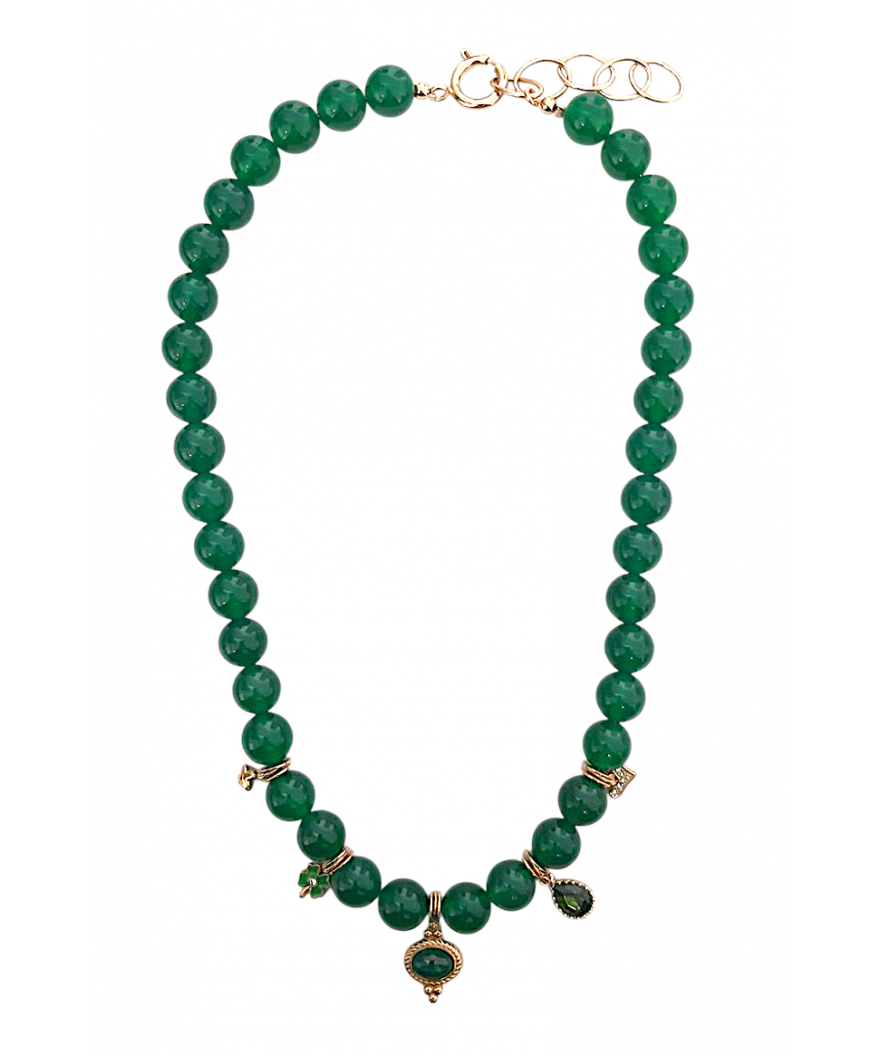 Collier Eden composé de perles en agate verte et de pendentifs charm's et d'un pendentif ethnique composé d'une pierre en malachite.